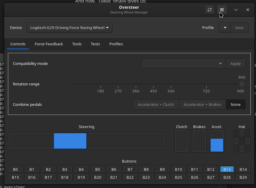 Okay, so Oversteer isn't detecting the wheel, and jstest isn't reporting any changes in any of the axes, just buttons. Weird. The wheel has the centering spring engaged, it resists being turned, which on Windows typically meant that G-HUB wasn't running.